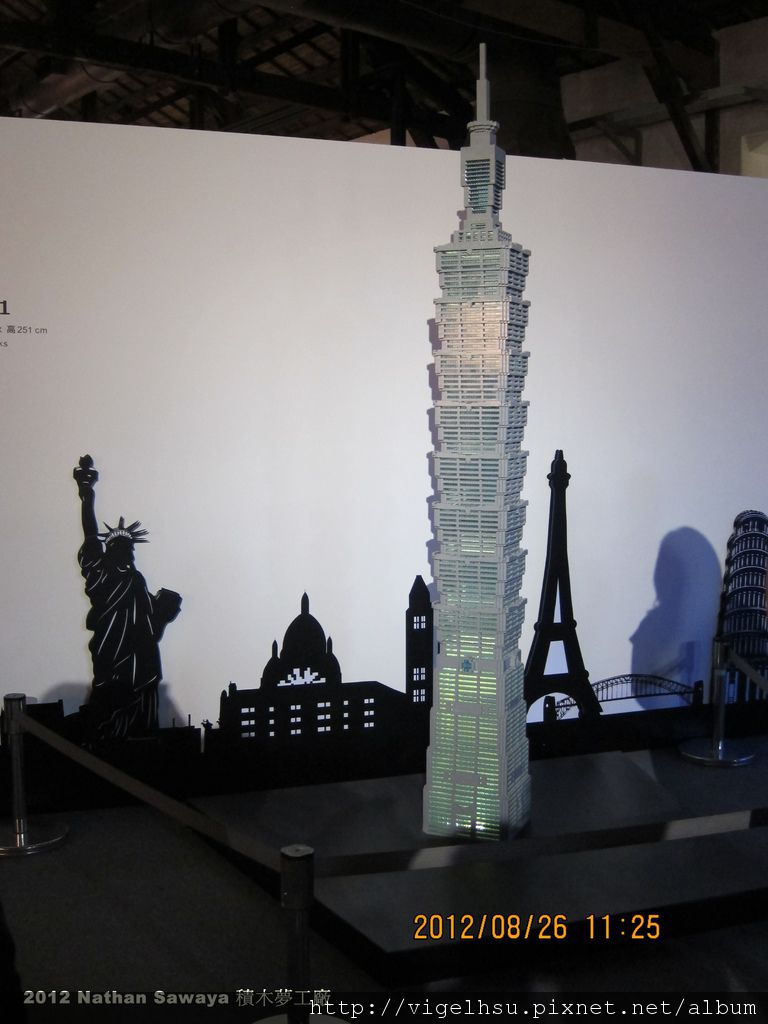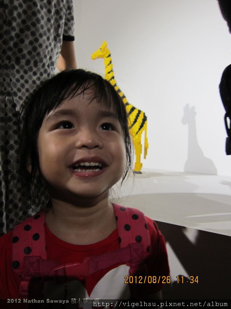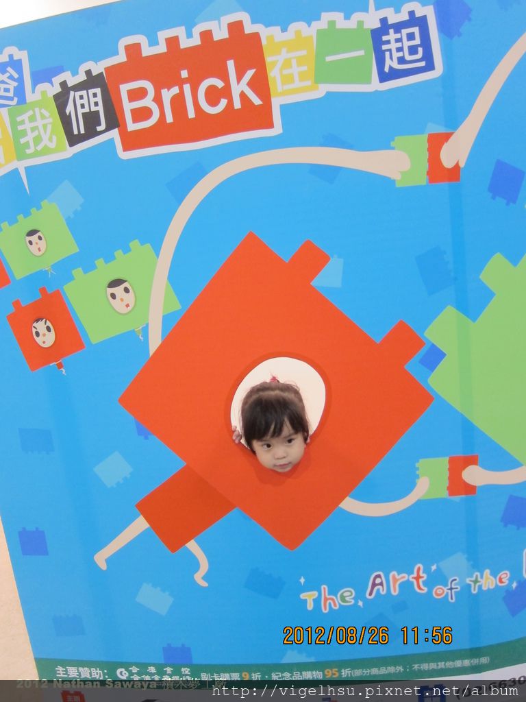 終於看完這人擠人的樂高積木展了,彤寶看到立牌,很自動地靠攏過去,說要和那立牌拍照~